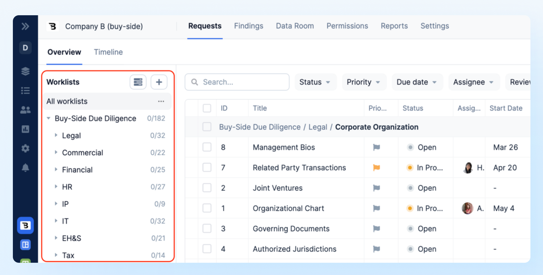 Tailor your due diligence or integration worklists to each functional department to enable precise organization, ensuring teams efficiently tackle tasks relevant to their expertise. This feature enables you to create subworklists within your main lists, aligning responsibilities with specific teams or individuals. By doing so, you streamline collaboration and enhance productivity throughout the acquisition process.