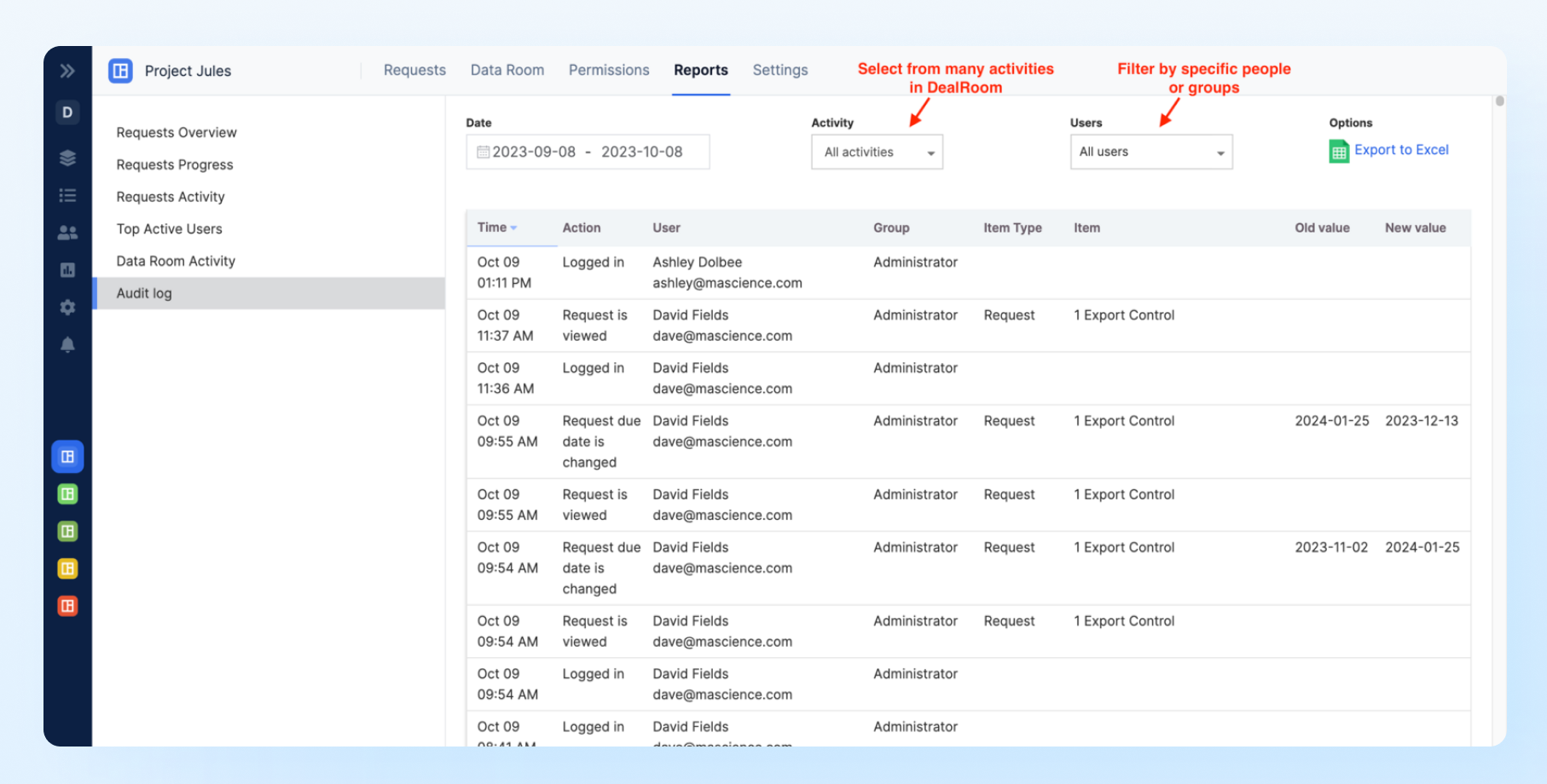 Gain invaluable insights into your deal activities with DealRoom’s comprehensive audit log. Track user actions, deal document views, and engagement metrics in real-time, enabling you to make informed decisions. With DealRoom, harness the power of data-driven insights to drive productivity and drive deals forward.