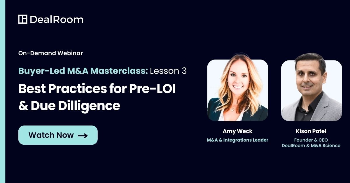 A unified platform like DealRoom powers the process. It connects strategy, diligence, and integration in one place, enabling real-time collaboration, visibility, and accountability across teams.
