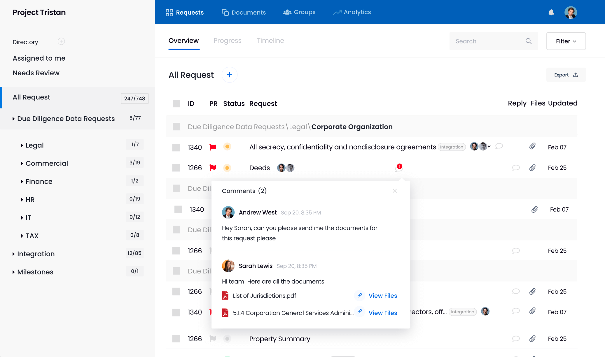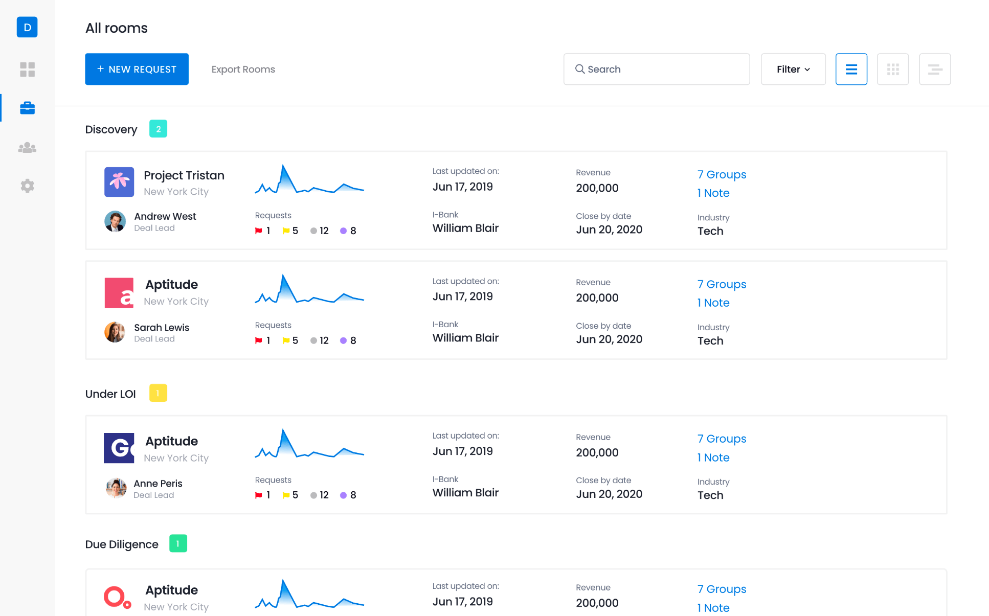 If a team is managing more than one deal with DealRoom, users can simply switch between deals with the click of a button. Our deal flow tracking software acts as a deal’s CRM. It allows users to see an overview of each deal from the “Dashboard” view.