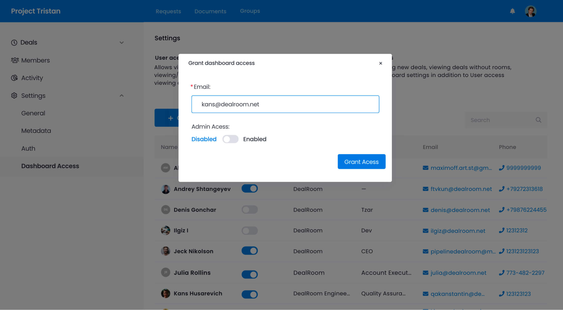 The deal pipeline access page is where admins can quickly see what type of access each user has to the pipeline. They can see users’ title, company, email, and phone number. From here, admins can also turn admin access on and off for other users, as well as grant deal pipeline access. Each user who has access to the pipeline is either a pipeline admin or pipeline general user.