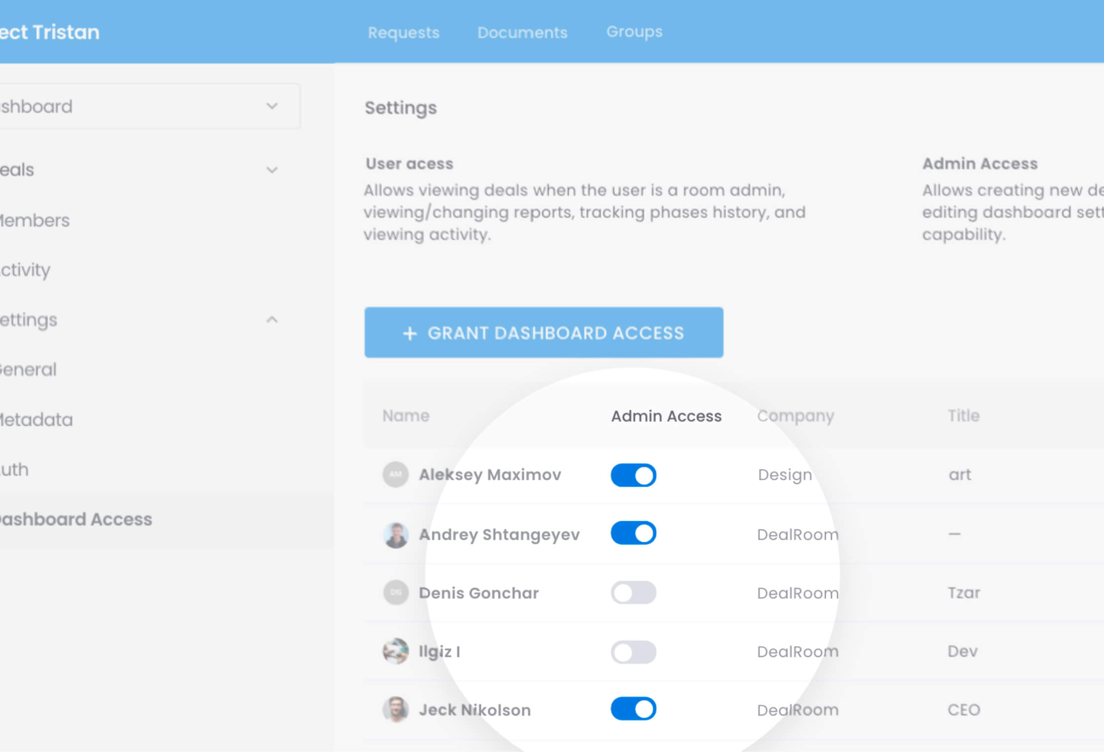 The pipeline general users who are also room admins can view and edit deals / reports, track phases history, and review room activity. The pipeline admins can create new deals, view all deals with or without rooms, edit pipeline settings, and also adjust user access capabilities.