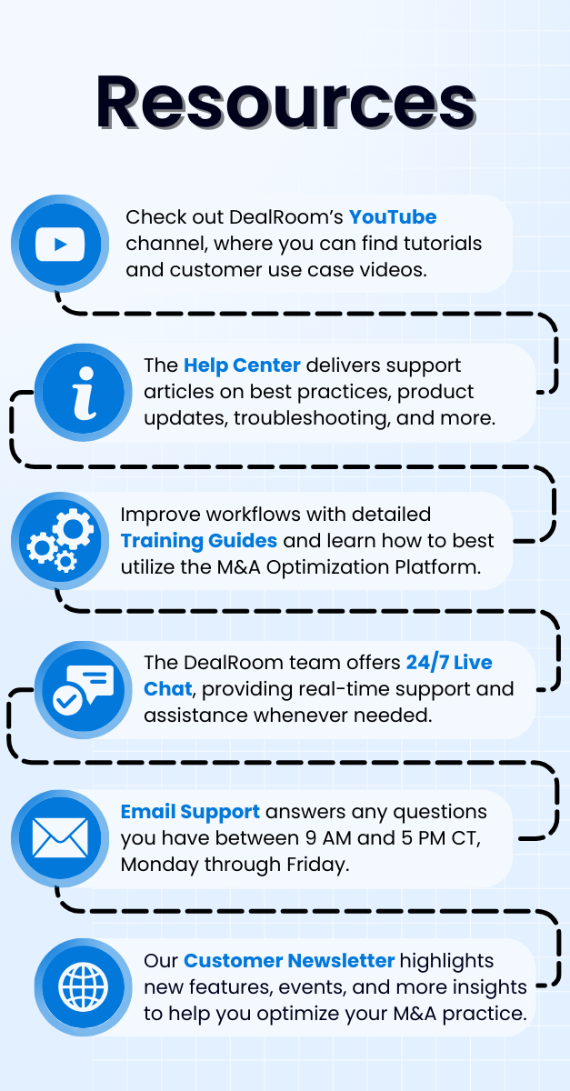 DealRoom’s customer onboarding process is pivotal in supporting company-wide system adoption to ensure new users can fully leverage its capabilities to drive their M&A activities. Through thorough, personalized training sessions, dedicated support, strategic resource guides, and more, businesses can become proficient with the platform more quickly and effectively to significantly enhance their deal efficiency and execution.