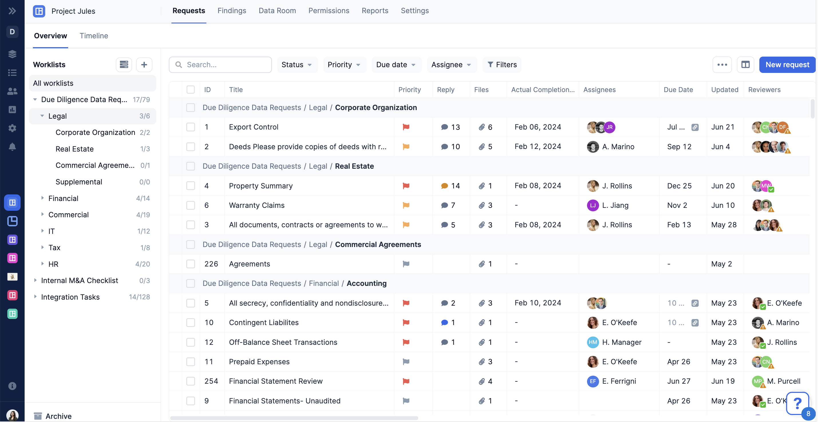 Later, a thorough review and analysis of all other areas of the business must be done to gather information about the target’s customary structure, employees, legal and regulatory compliance, real estate, technology, and intellectual property, among other categories. Typically, people utilize a data room or another management software like DealRoom's M&A Platform to conduct these procedures, communicate with stakeholders, collect documents and responses to the due diligence questions, and process requests.