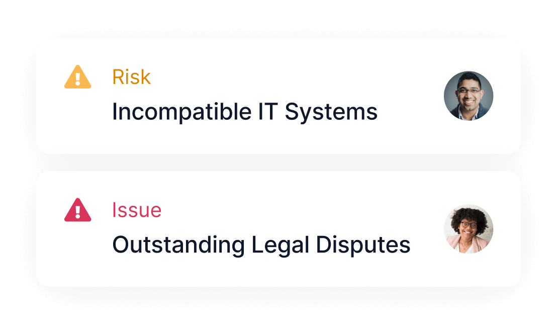 Scattered deal data, diligence documents & findings across multiple tools complicates integration planning.