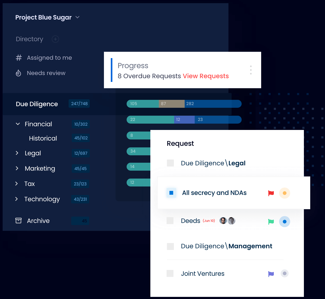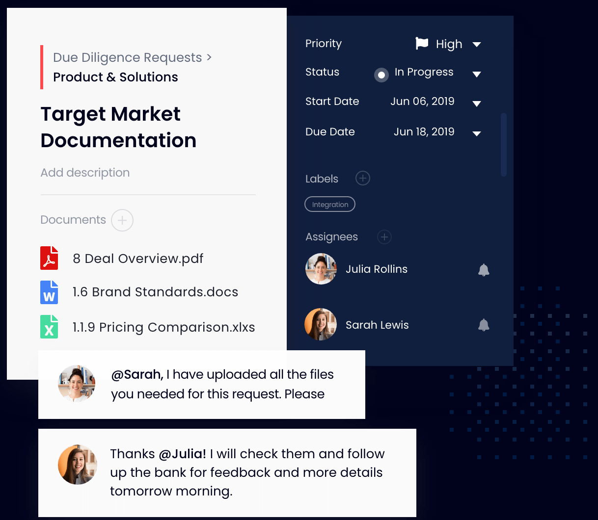 Complete due diligence on one platform, eliminating Excel trackers and emails.