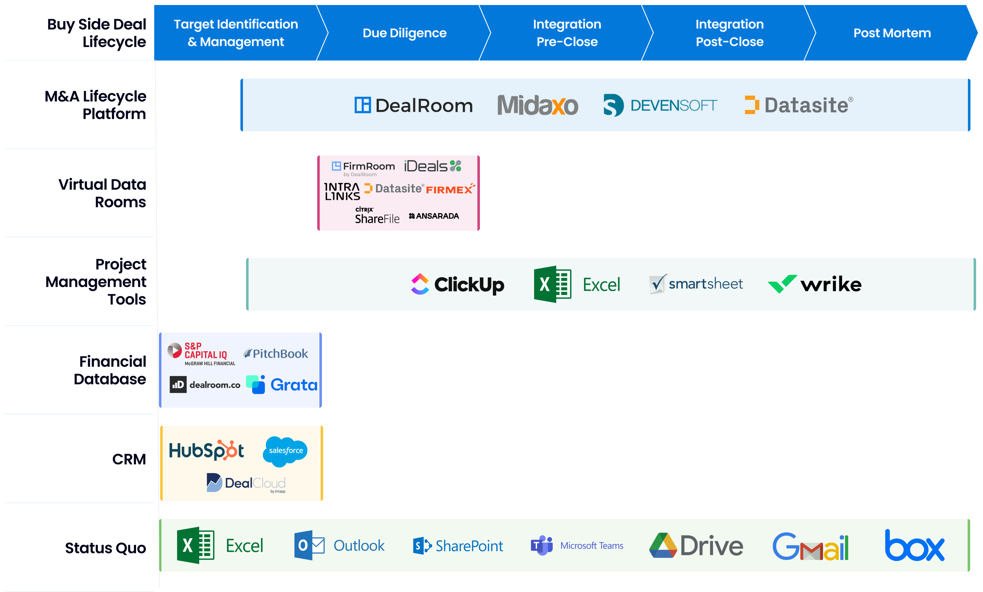 Project management tools like Clickup, Excel, Smartsheet, Wrike and others have been around for quite some time but have only recently been adopted by the M&A industry. Project management in M&A is not geared towards one specific aspect of a deal but towards a team’s overall workflows and processes. These tools help teams identify and create consistent and repeatable workflows that aim to optimize operational efficiency.