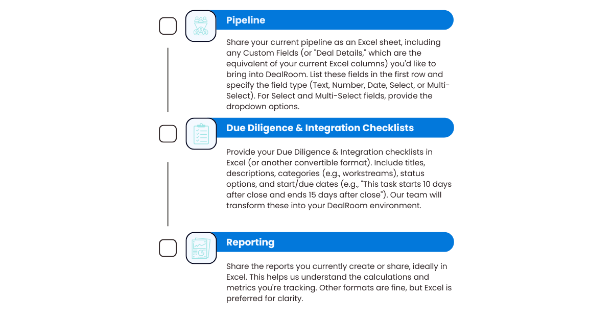 - We’ll import your data—from pipeline trackers to Due Diligence & Integration checklists—and start building your DealRoom environment! Simply send us your data, and we’ll take care of the setup! See the "Get Started" section below for what we need to begin!