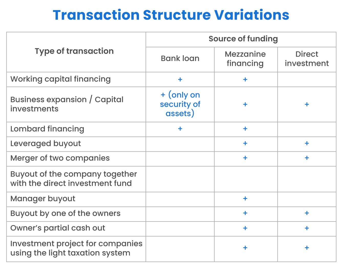 A key advantage over other instruments is that mezzanine financing allows many variations of the transaction structure. This allows to use mezzanine in virtually all types of transactions.