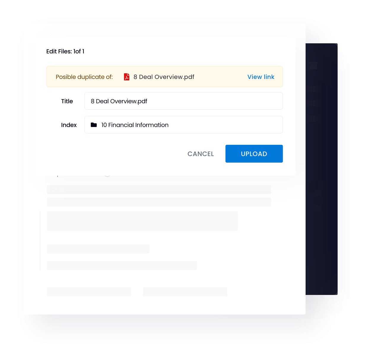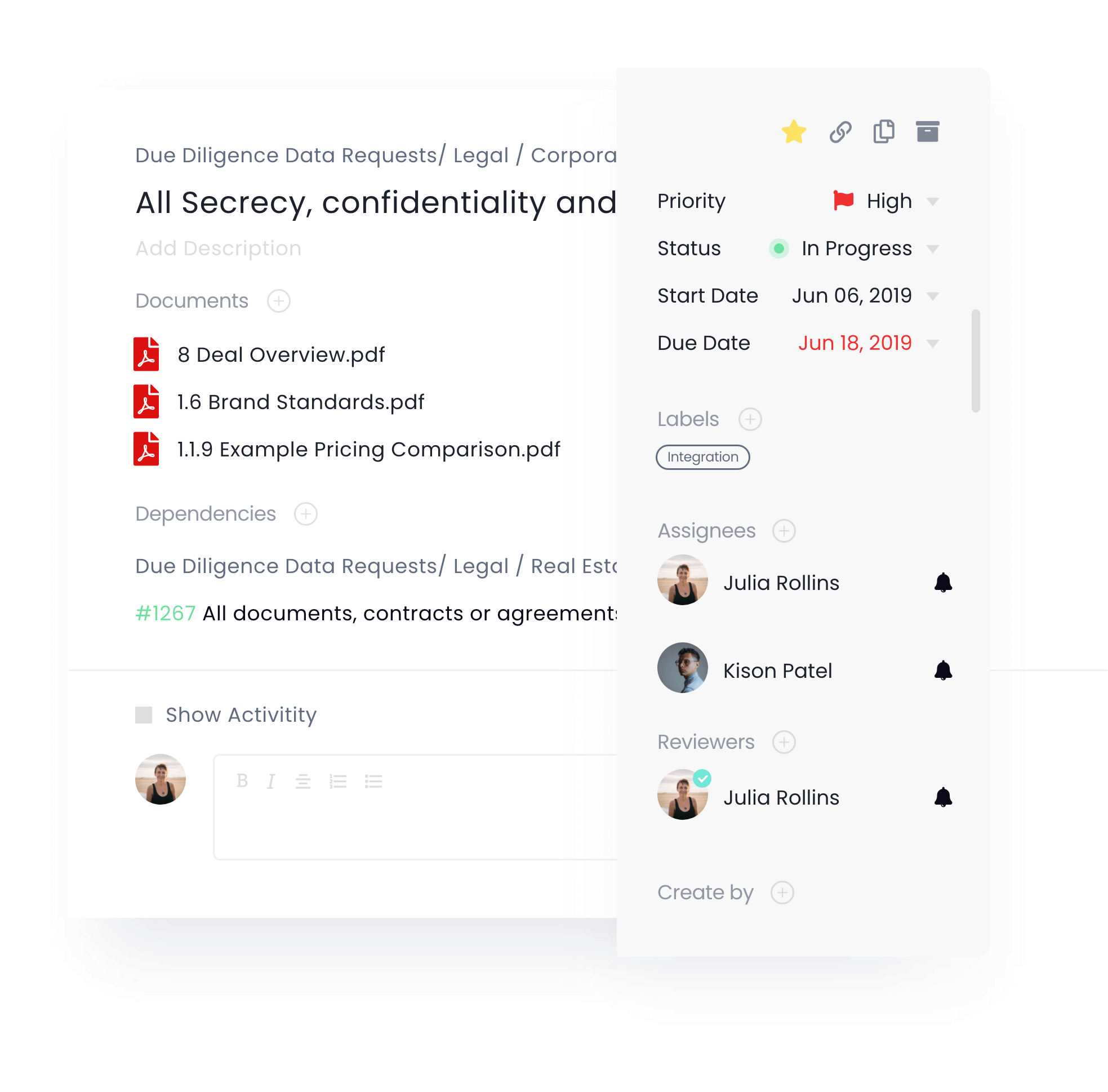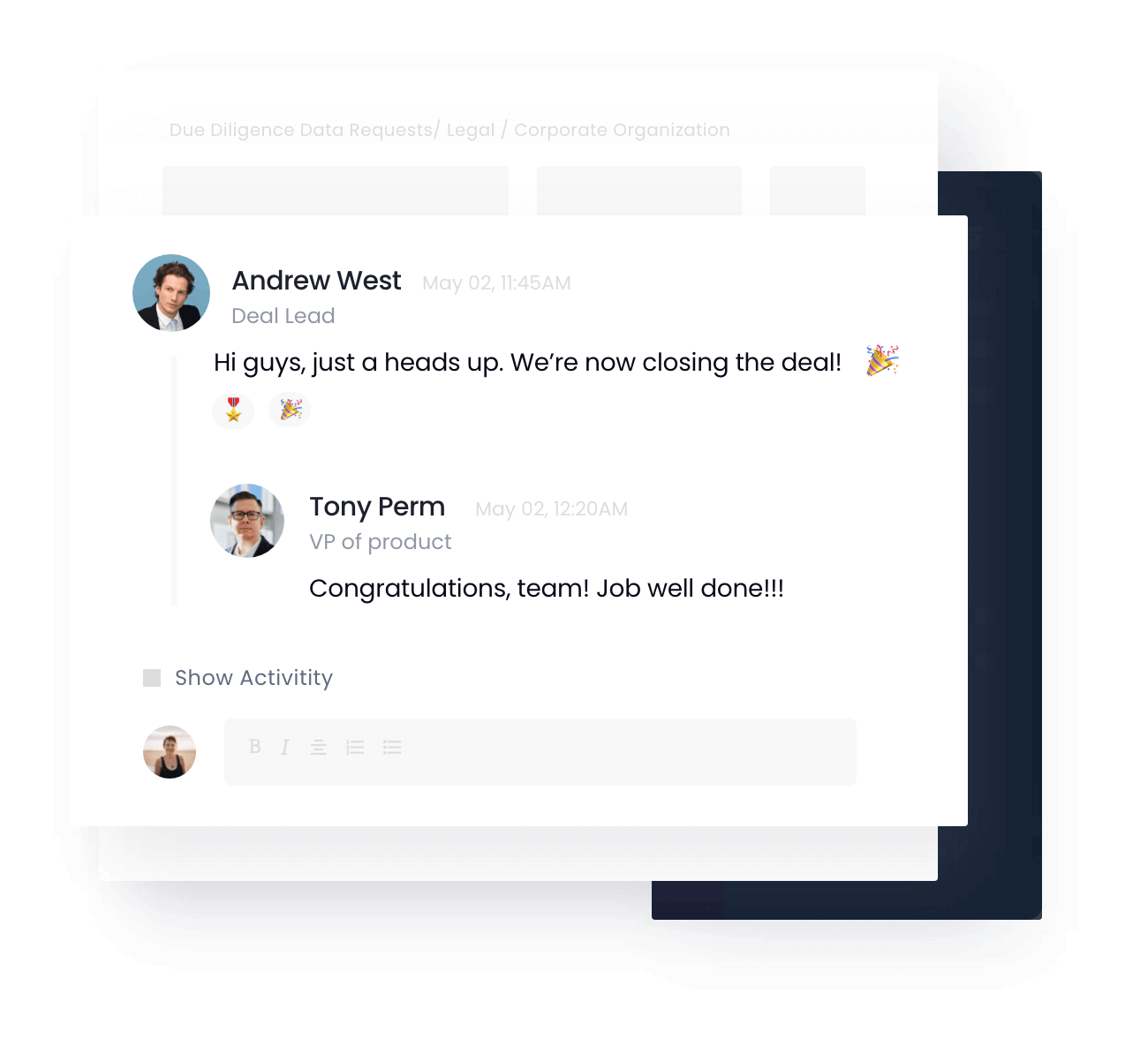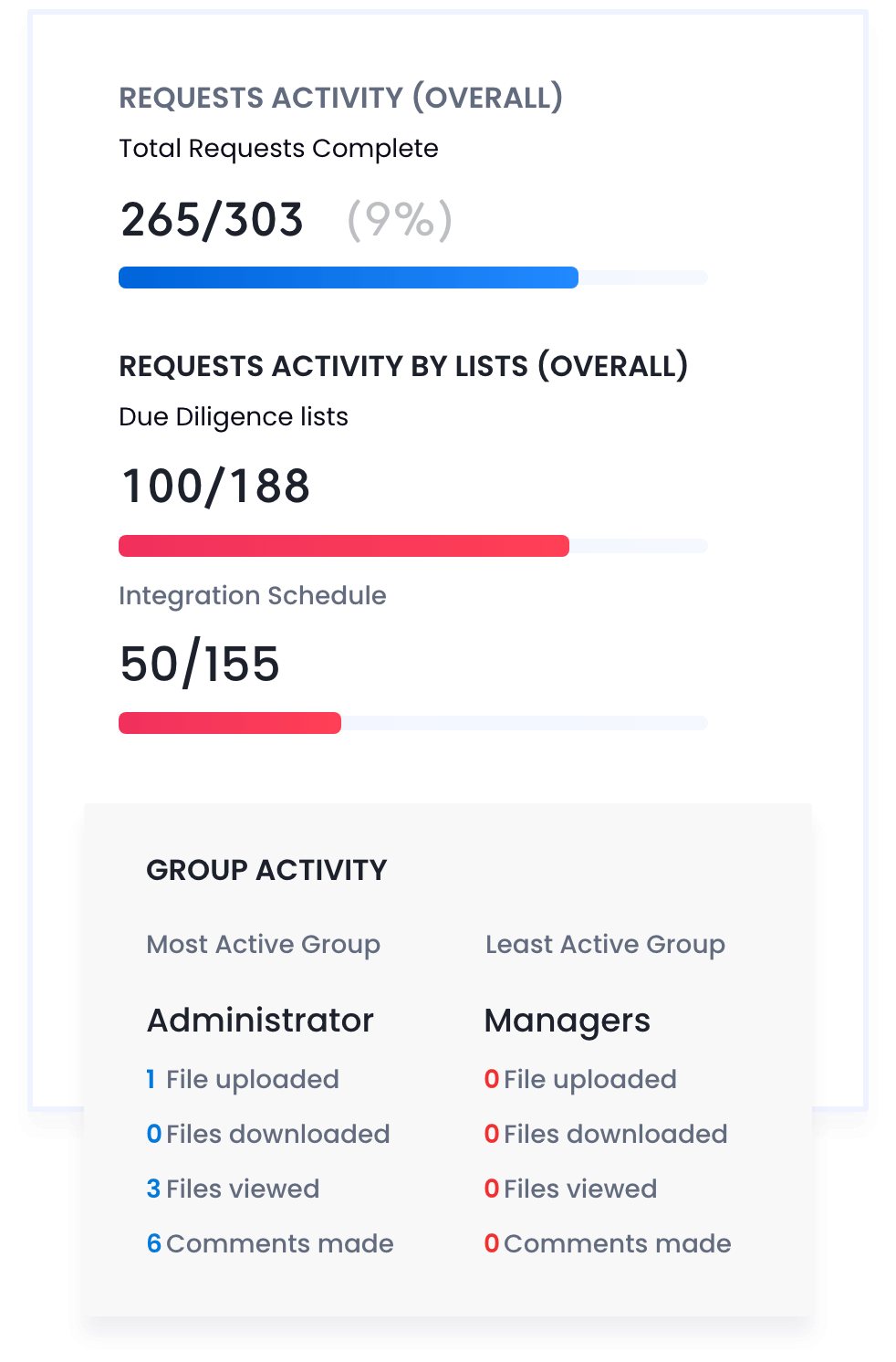 Speed up your process with DealRoom’s library of pre-made templates that ranges from due diligence, form of LOI, flows of funds, to integration and more.