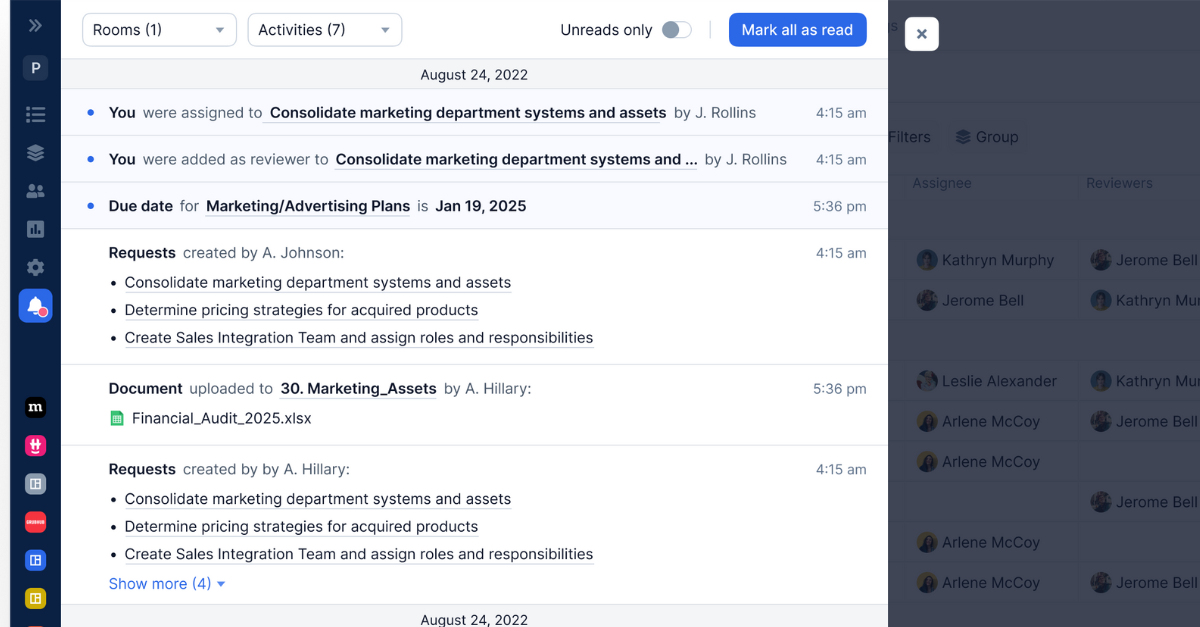 - Announcements keep stakeholders aligned with deal-wide updates.